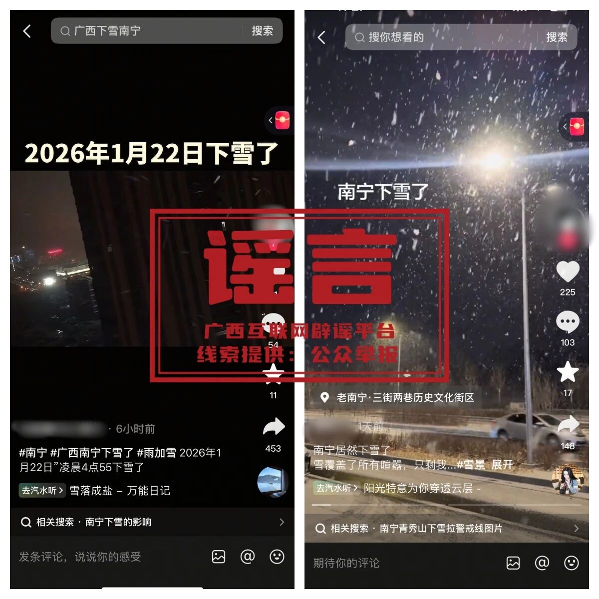 據(jù)“廣西新聞?lì)l道”微信公眾號(hào)報(bào)道,廣西氣象臺(tái)的首席預(yù)報(bào)員接受記者采訪時(shí)明確表示,經(jīng)過(guò)核查,南寧市區(qū)內(nèi)氣象臺(tái)站并未觀測(cè)到降雪,且最近幾天南寧市區(qū)最低氣溫都在0℃以上,不具備降雪條件。那么視頻里的“雪”是哪來(lái)的呢,有攝影專(zhuān)業(yè)人士指出,這很可能是在飄雨的時(shí)候,用燈光照射配合慢速快門(mén)拍攝出來(lái)的效果,至于那些異常精美的雪景圖,基本可以判定是未經(jīng)標(biāo)注的AI生成圖片。