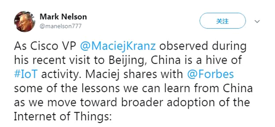 曾當(dāng)過(guò)記者的網(wǎng)友“Mark Nelson”在推特上轉(zhuǎn)發(fā)了這篇文章,并寫(xiě)道:“思科副總裁馬切伊在他最近的北京之行中觀察到,中國(guó)是物聯(lián)網(wǎng)活動(dòng)的中心。他跟我們分享了在物聯(lián)網(wǎng)技術(shù)應(yīng)用日益廣泛的今天,中國(guó)在這方面值得學(xué)習(xí)的成功經(jīng)驗(yàn)。”