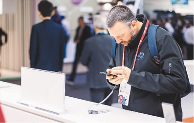 2月26日,2018年世界移動(dòng)通信大會(huì)在西班牙巴塞羅那會(huì)展中心開幕。圖為國(guó)外參會(huì)者在中國(guó)手機(jī)品牌小米的展臺(tái)前參觀體驗(yàn)。智淵 攝