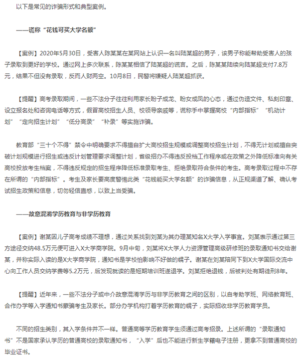 教育部官網(wǎng)8日發(fā)布預警:2021年普通高校招生錄取工作即將開始,一些不法分子利用考生和家長等待錄取信息的緊張急切心理,設置“招生陷阱”誘騙考生和家長。